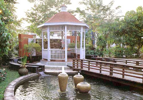 ![]() เชื่อมลานอเนกประสงค์ กับศาลาพักผ่อนด้วยสะพานไม้ พร้อมประดับบ่อปลาด้วยโอ่งน้ำพุเล็กๆ เพื่อสร้างจุดสนใจ | |||||||||