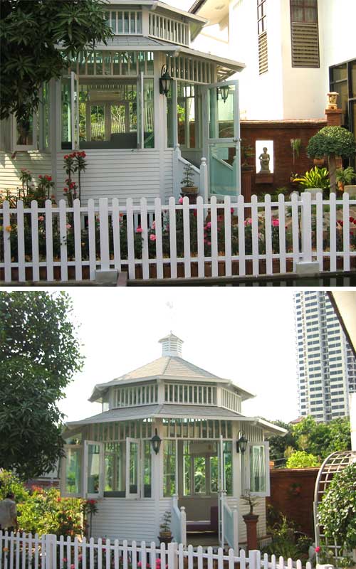 ![]() Grand Victoria ขนาดเส้นผ่าศูนย์กลาง 4.50 เมตร ในสวนในบ้านของคุณอาบพร รอดบุญ ติดกระจกเขียว พร้อมประตู-หน้าต่าง เพื่อทำเป็นห้องนั่งพักผ่อนในสวน ด้านล่างเป็นไม้ปิดทึบ |
